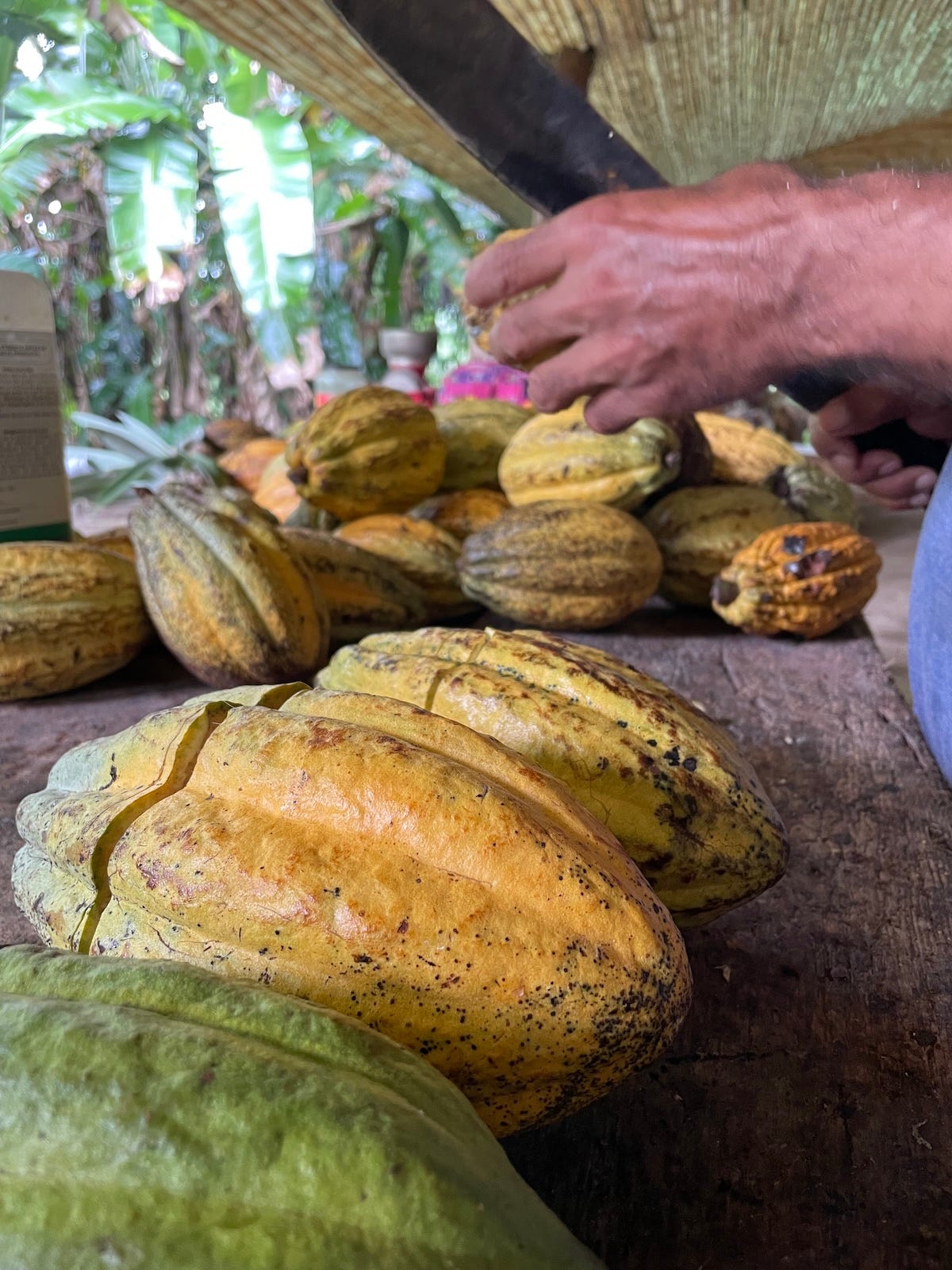 This morning I was standing at the worktable while a cacao pod was opened, watching as the machete moved through the thick skin with a familiar, practiced motion and the pod gave way in two clean halves, revealing the seeds inside, packed closely together and covered in a pale pulp that still belongs entirely to the fruit and gives no real indication yet of chocolate.